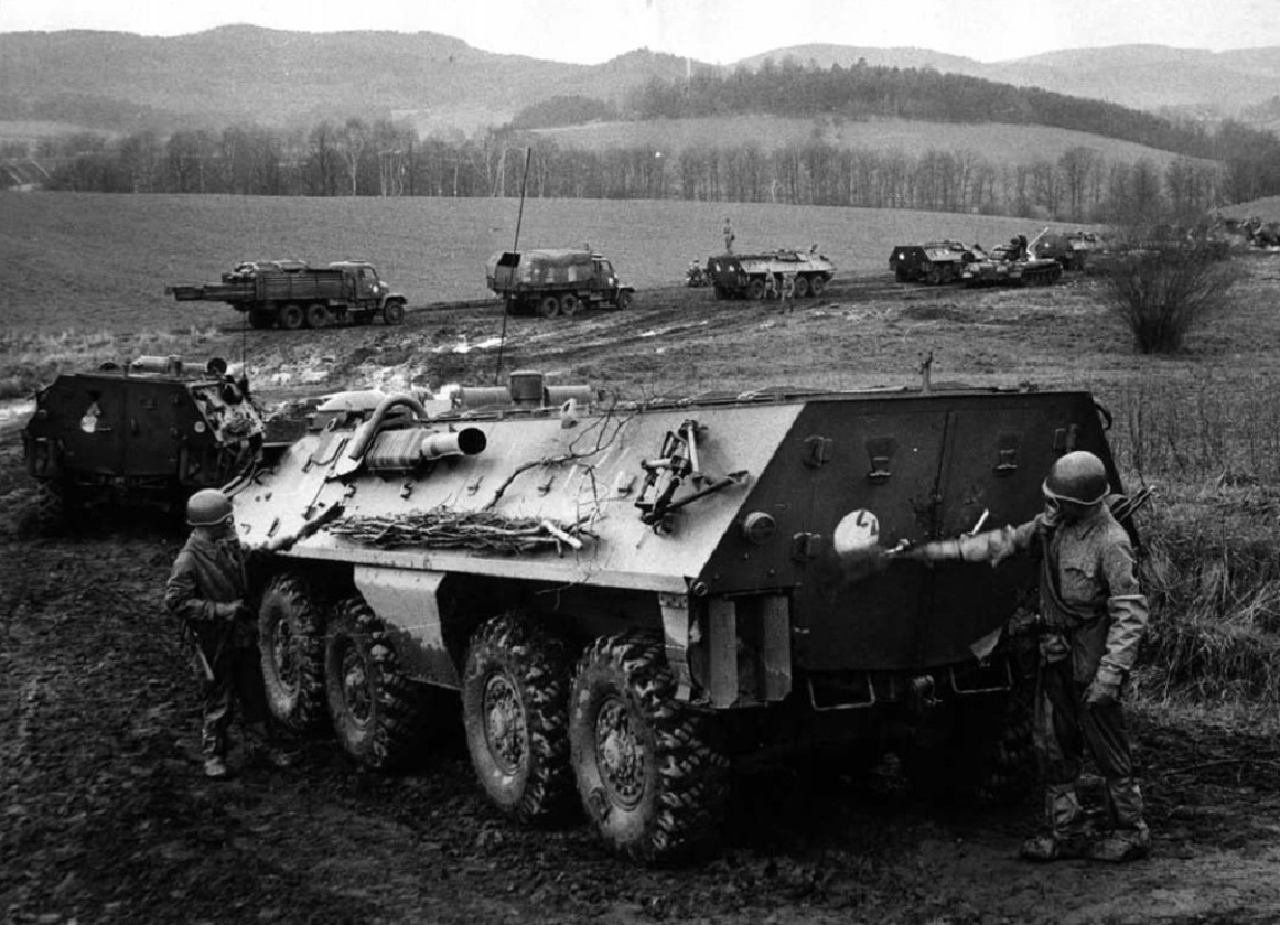 シュマヴァ演習に投入されたOT-64装甲車。チェコスロバキアとポーランドが共同で開発した。BTR-60装甲車の設計上の欠点を改めたもので、当時の装甲車としては先進的な外見を持つ。