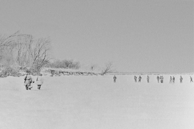 殺害されたペトロフ二等兵。国境軍政治部のカメラマンでもあった。動画用カメラは人民解放軍に奪われたものの、レンジファインダー付カメラは彼の遺体に隠れ、その場に残った。