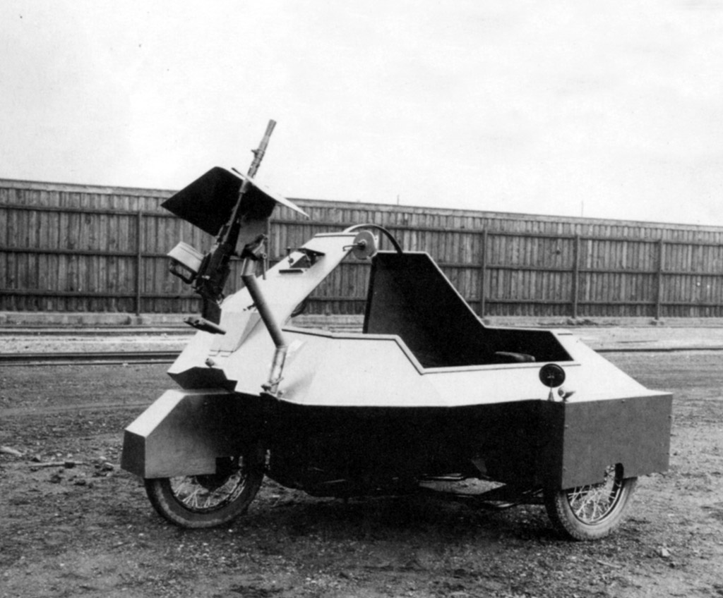残された写真を見ると、機動隊の盾めいた運転手保護用の角ばった装甲板の他に、前輪と側車の搭乗者保護用の湾曲した装甲板が付けられ、水冷バレル付きの機関銃が側車に搭載されているんですが、背面や側面はほぼ無防備