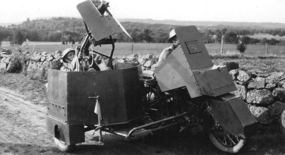 一方欧州でのこと、スウェーデンでは1930年頃から自軍向けに輸入したハーレーダビッドソンの装甲化モデルの製作がランズヴェルク社で行われていて、初期のL-190と称されるタイプはやはり側車付の形式に装甲版をリベット止めするものでしたが、後のハーレー社自身製作の物より武骨な外見ながら、操縦者と同乗者の保護範囲はより広いものであったようです