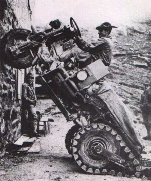1950年代末のイタリアでのこと、当時物資輸送手段を未だラバさんに頼っていた精鋭山岳部隊の為に、国防省はモト・グッツィ社に依頼して新たな山岳地帯用輸送車両を製作させたそうなんですが、完成した「機械のラバ(MuloMeccanico)」 は三輪駆動のトライクで、後輪には必要に応じてクローラーを装着できるテンショニングローラーが装着されていたそうです
