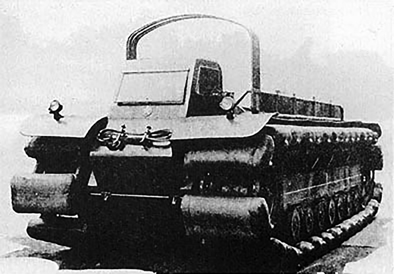 最初に製作されたモデルはどうも三つの車輪を全て履帯に置き換えたもののようだったんですが、総重量600㎏を超えるこちらは将来性に乏しいと判断され、前輪は車輪、後部に2列の履帯という2番目の試作車両が1934年に完成