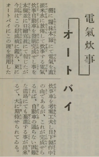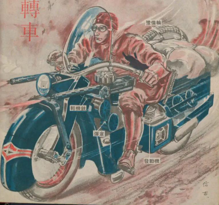 1942年発行の雑誌「機械化」9月号に、「未来兵器 突撃オートバイ」と称した架空兵器の活躍想像図が掲載されているんですが、「新案兵器 突撃自動自轉車(オートバイ)」と題するこのオートバイ、附記された解説によるとハンドルの両側に軽機関銃を二挺備え、発射しなが
